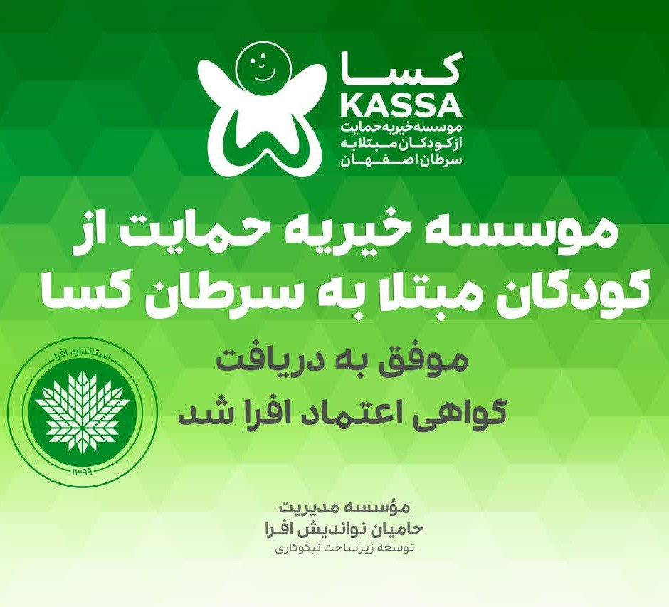 پس از ارزیابی صورتگرفته توسط تیم ارزیابی مؤسسه حامیان نواندیش افرا بر اساس استاندارد افرا، مؤسسه خیریه حمایت از کودکان مبتلا به سرطان اصفهان کسا توانست گواهی اعتماد شش ماهه افرا را در دیماه ۱۴۰۴ اخذ کند.